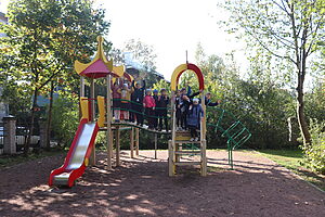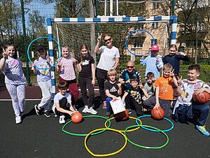 Словно добрый волшебник превратил небольшую возвышенность в спортивную площадку, каменистую поверхность почвы — в альпийские горки, зелёные полянки — в игровые площадки, тенистую аллею — в сказочный грот, а кирпичные стены гимназии — в удивительный замок.