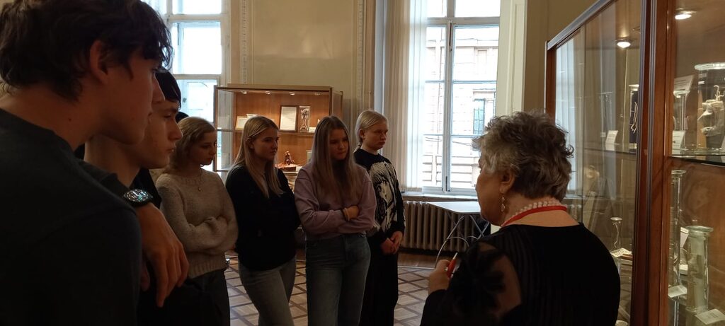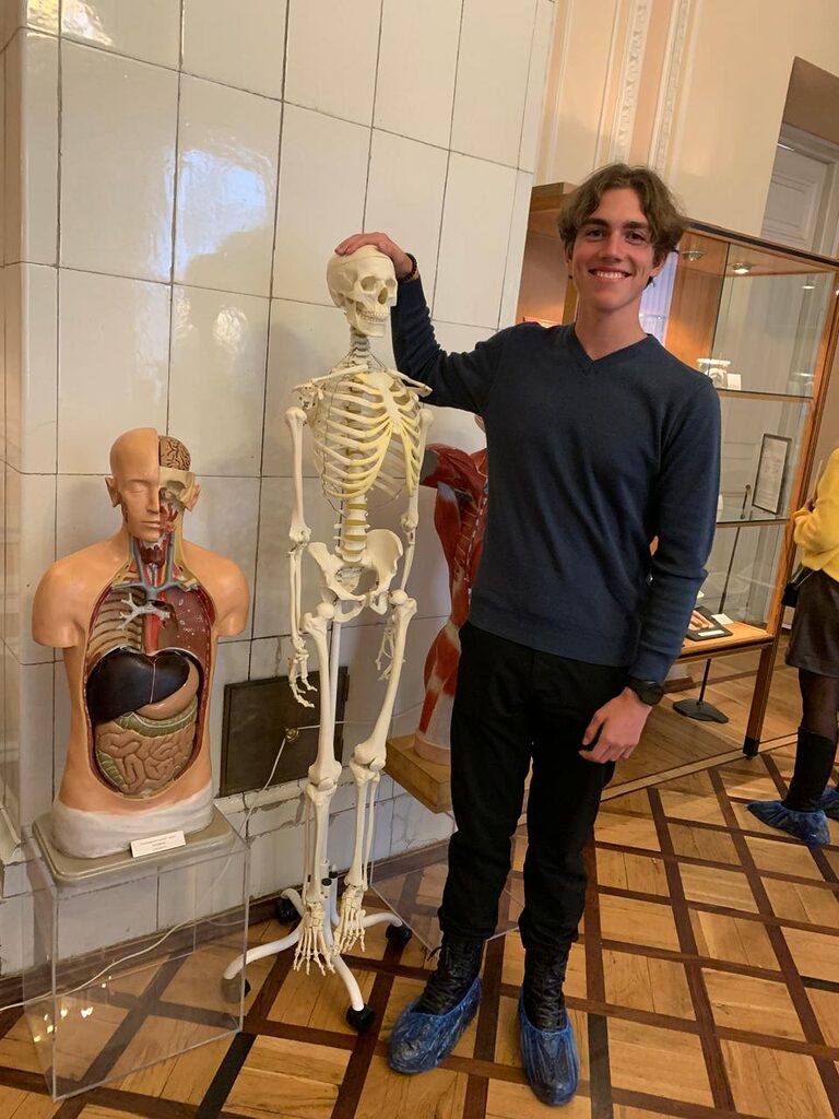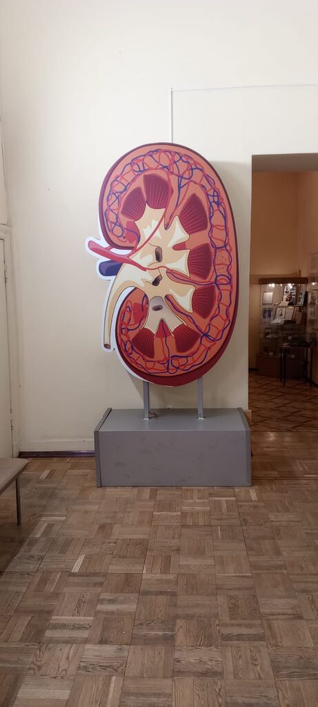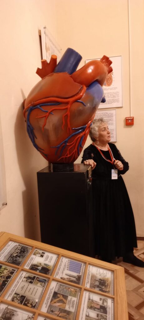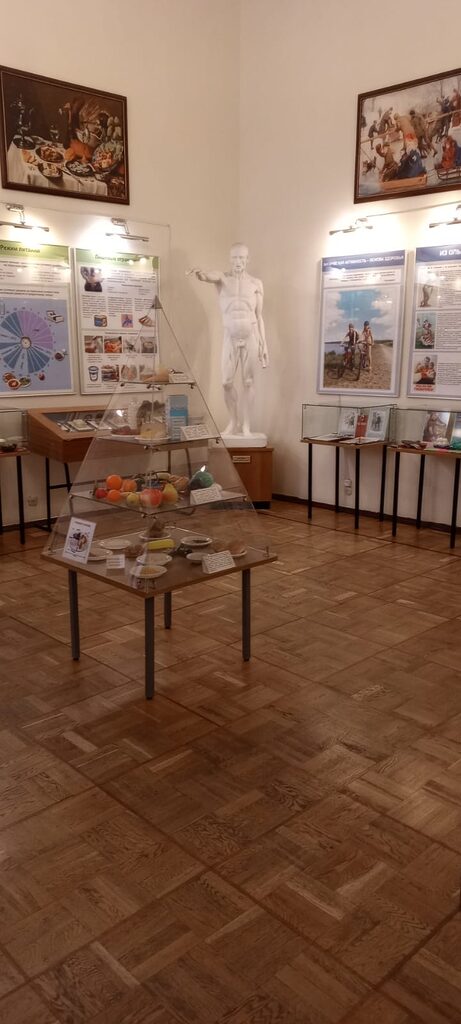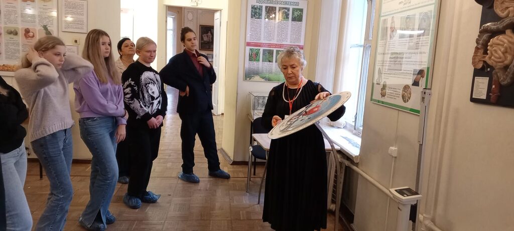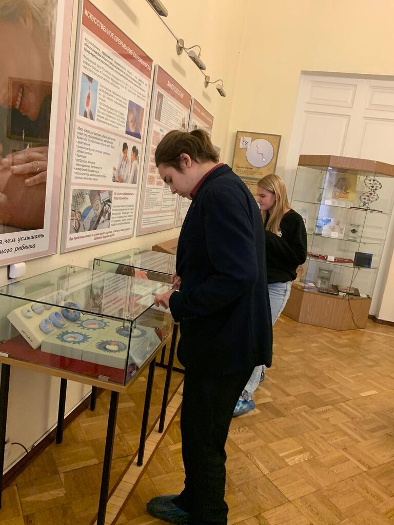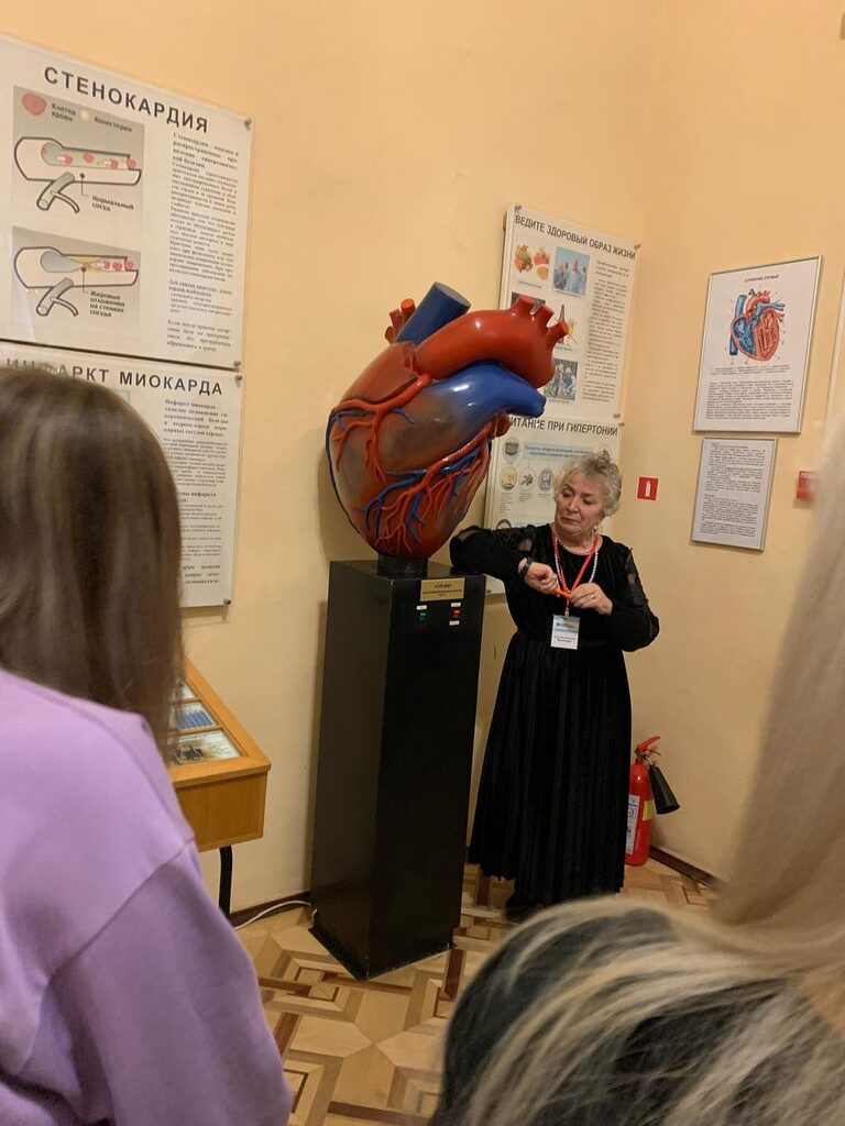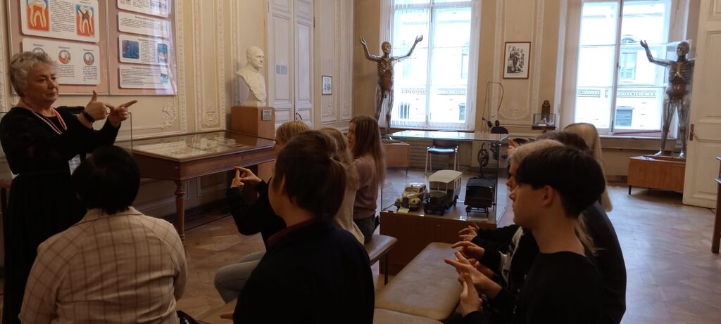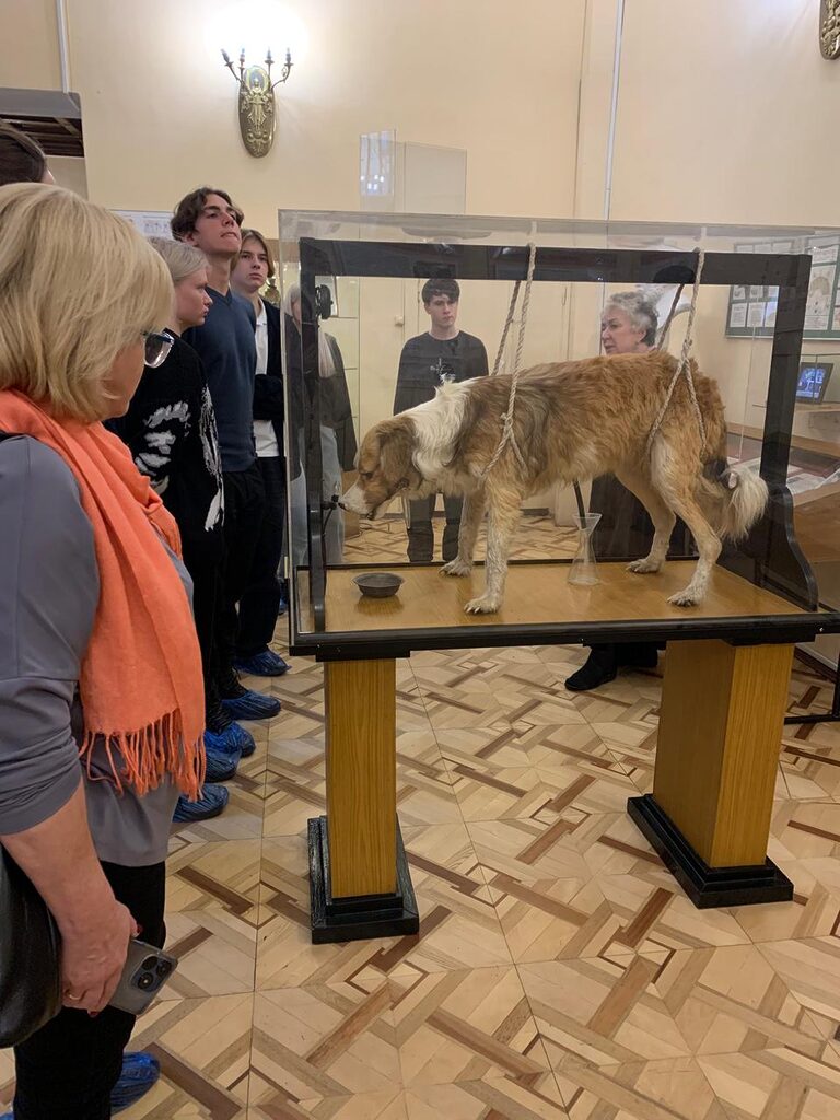 Ребята увидели широко известный макет «Собака Павлова» — один из первых экспонатов музея, демонстрирующий механизм выработки пищевого рефлекса. Экспозиция музея также включает в себя объемную модель сердца, на которой экскурсовод показала гимназистам его работу.